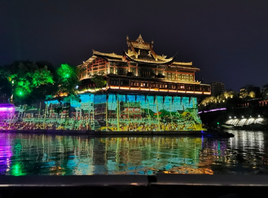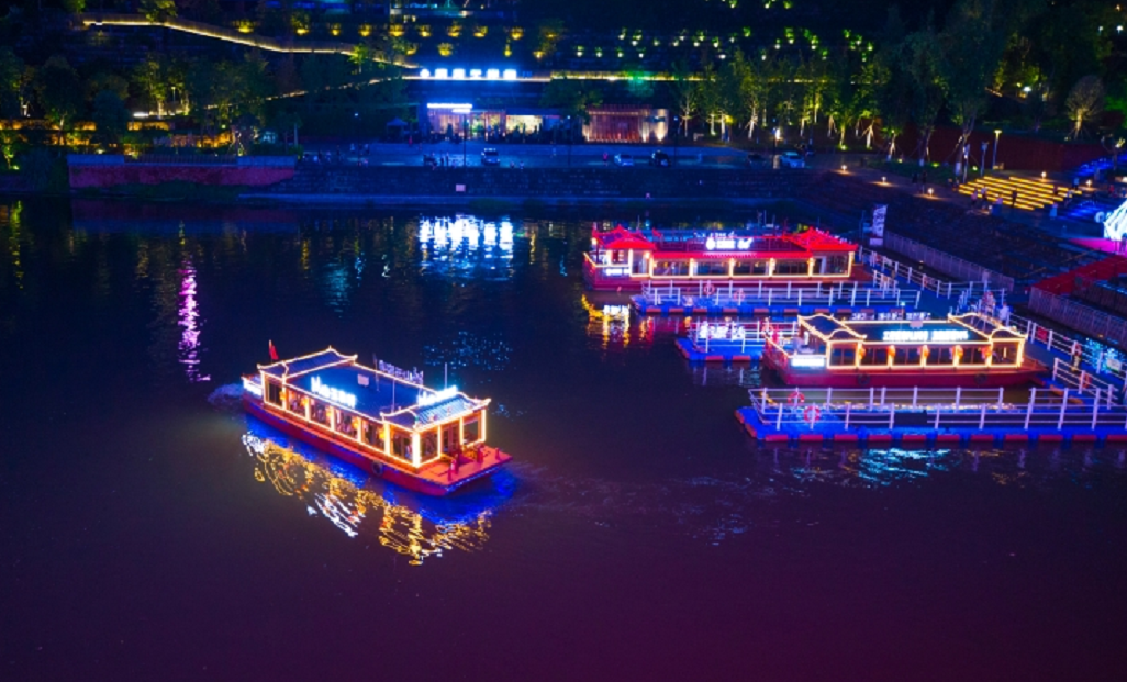 从自贡汇兴路1号桥码头出发,在蜿蜒曲折的釜溪河中乘船游览,至自流井老街码头,全程约6.2公里。这就是自贡围绕“水上灯会”这一主题,打造的“夜游釜溪”项目。夜游釜溪”以“一河三弯四段”为设计主线,通过传统彩灯+现代光影相结合的方式,在山川桥梁、沿河风物上“挥毫泼墨”,再现城市文明历程和人文精神,并串联起釜溪河文化博览园、文创公园新街里、王爷庙、自流井老街等文化旅游城市地标,让游客享受一场与众不同的水上灯会盛宴。