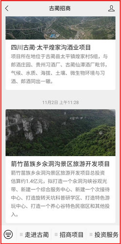 优化古蔺招商引资微信公众号,不定期发布和更新招商项目、优惠政策、投资服务等招商信息;发挥县工商联桥梁纽带作用,加大与全国性行业协会、商(协)会及专业招商机构合作力度,获取优质信息。