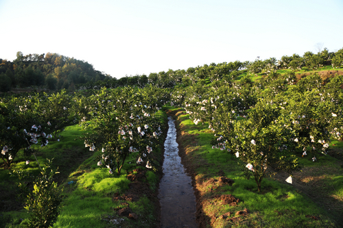 你栽果树我出地、你出技术我出力、你收果子我服务,村集体经济公司与泸州红柯农业有限公司携手发展,引进蒲江柑橘栽种技术和营销模式,打造了1200余亩柑橘种植基地。一垄垄的柑橘树漫山遍野,经过三年的精心管理,今年开始大量收获,个大汁甜的“金果果”挂满枝头,村民们正在忙着采摘。