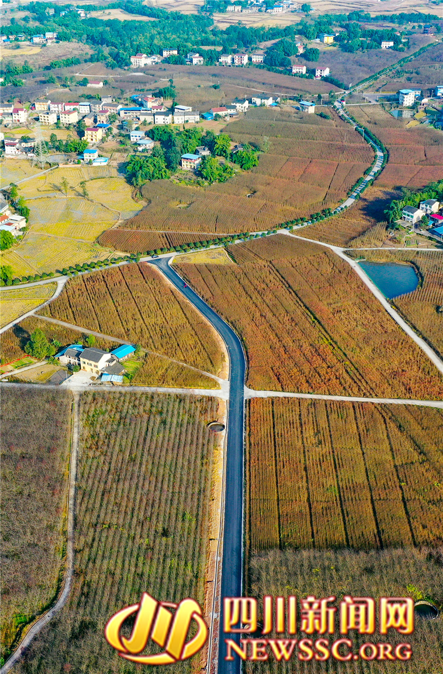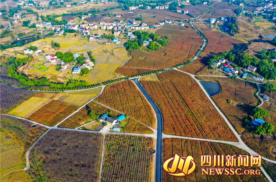 | 11月30日,鸟瞰四川省华蓥市禄市镇在锦绣田园延伸的的乡村公路。 |