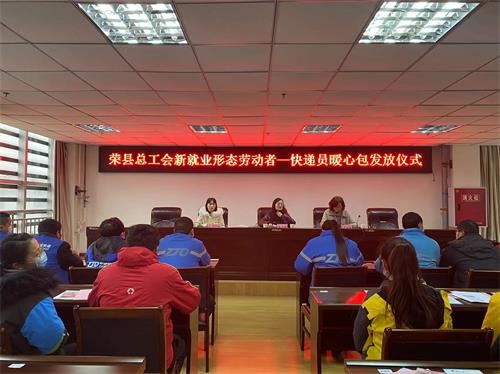 四川新闻网消息 1月12日,荣县妇联与县总工会、团县委联合举办新就业形态劳动者暖心包发放仪式和“送法进万家”活动,来自全县各快递公司快递员代表、网约送餐员代表共计60人参加了活动。