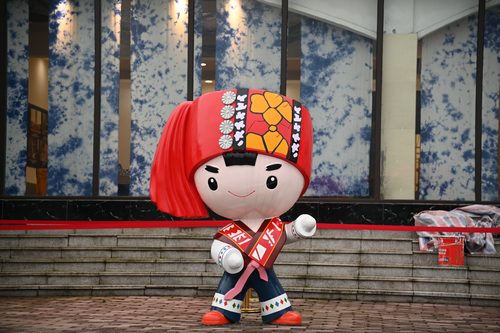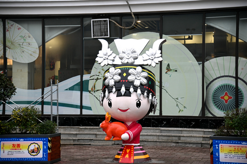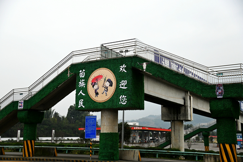 在泸州市叙永服务区广场,身着节日盛装的咪多咪彩塑像立于两侧,“苗族文化主题服务区”上方,是苗族图腾牛头图案,左边是吹芦笙的苗族男性,右边是面带笑容的苗族女子,似乎载歌载舞迎接八方来客。