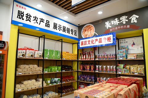 服务区内,便利店琳琅满目的苗族文化产品可供选择,餐厅墙壁上挂着苗族风情装饰画,手工提包、纽扣、抱枕、围巾等苗族扎染产品散发着地域韵味。