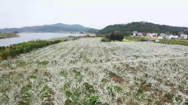 在该县石牛镇友谊村,300多亩“五月脆”花开正浓,白茫茫的李花在春天的田野里开出美丽的花海。微风拂过,空气里弥漫着李花淡雅的芬芳。朵朵雪白的李花,银装素裹,像北方的积雪,像天边的白云,又像大海边卷起的层层浪花。据了解,“五月脆”李自花授粉力弱,需要用其它授粉力强的李树品种对它进行异花授粉,类似水稻杂交。