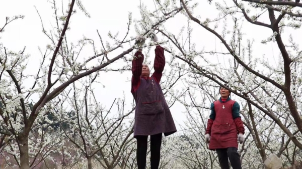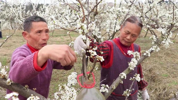“现在这个授粉目前可能还要做2到3天,因为‘五月脆’这个李子品种,自花授粉比较弱,需要异花为它进行授粉,这样做可以提高产量,提高李子的品质。接下来,在授粉结束以后,花谢到80%至90%的时候,我们将进行预防性使用微量元素补充李子的营养,这样结出的李子个头要大点也要甜一些。”梓潼县石牛镇友谊村“五月脆”李业主郝显东说。