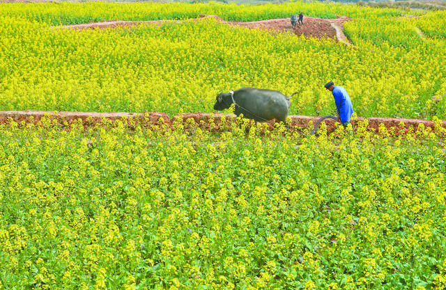 连日来,随着气温逐渐回升,邻水县石永镇邓家坡村的油菜花竞相绽放,与赶牛犁地的村民,构成一幅春意盎然的田园画卷。( 广安日报 邻水融媒 张天文 本报记者 曾诚 张启富 摄影报道)