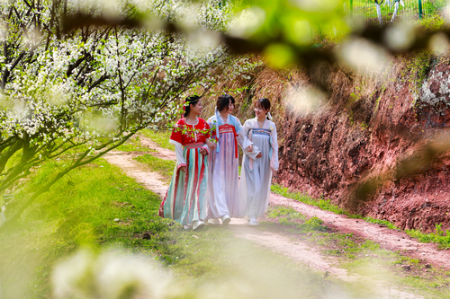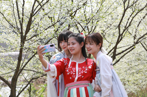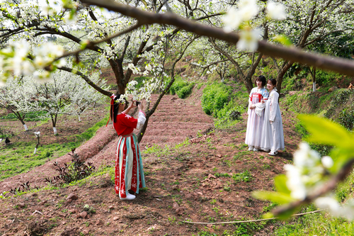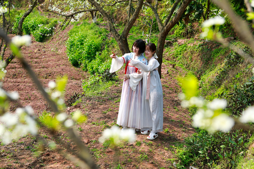 四川新闻网消息(杨尚威 记者 程海英/文图)2022年3月10日,在四川省泸州市龙马潭区顺江村内,身着汉服的游客正在盛开的梨花林内欣赏春光。