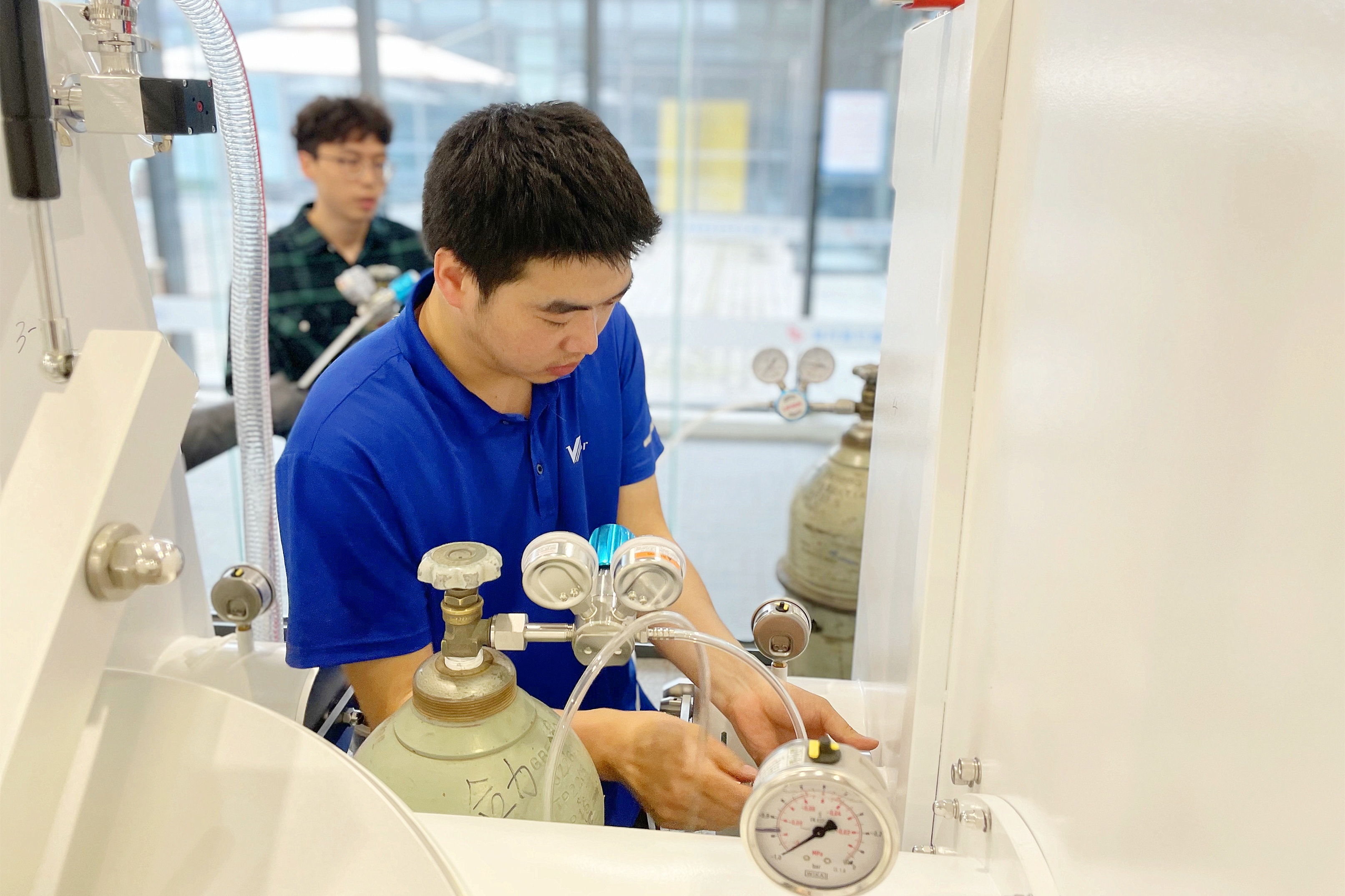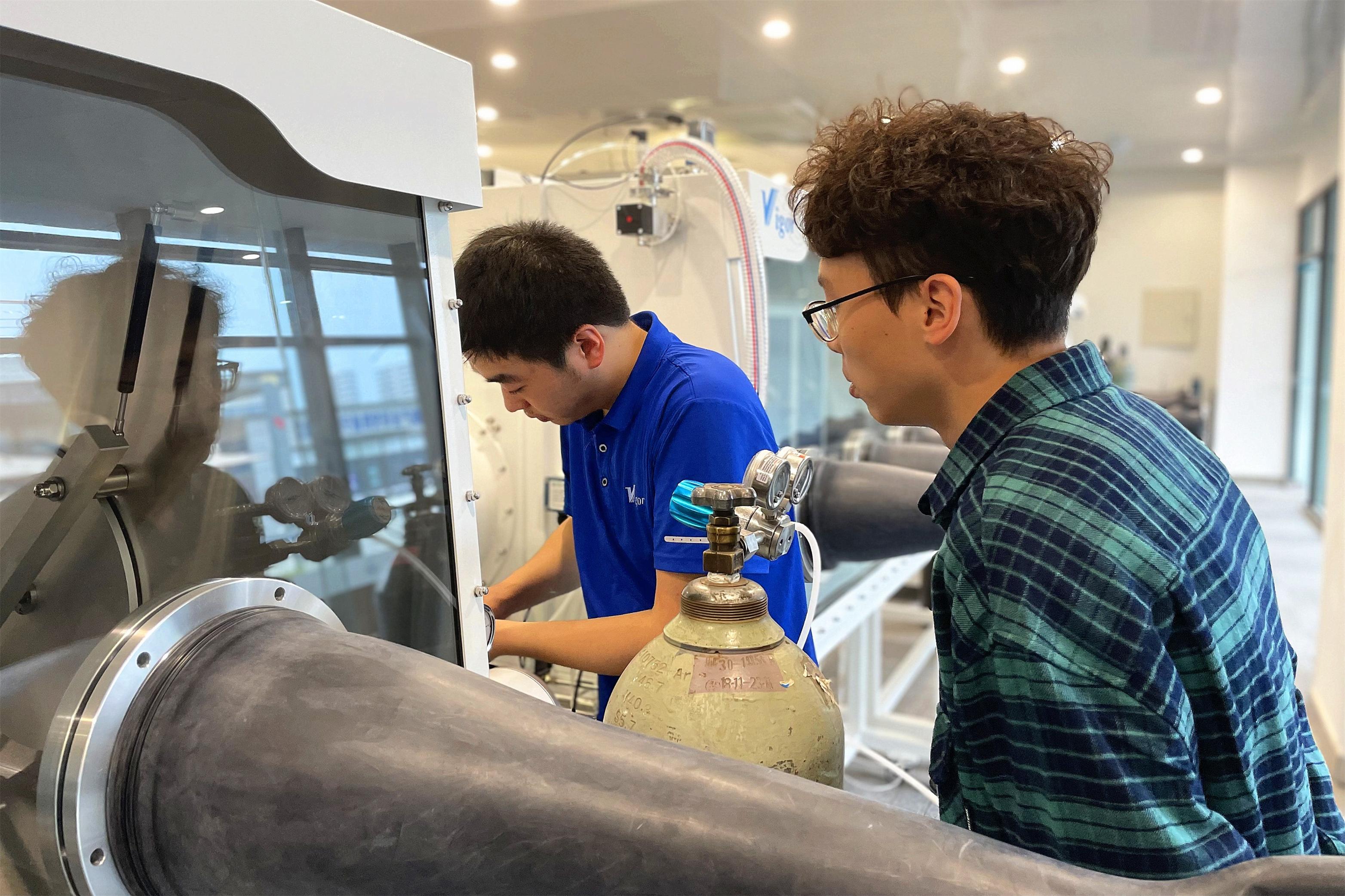 同一天,在位于“创客谷”的重庆大学锂电及新材料遂宁研究院里,技术工人正在对惰性气体氛围设备进行组装调试。目前,研究院已安装便捷式恒温干燥箱、真空干燥箱、自动叠片机、混合搅拌机等20余种设施设备,预计2023年底实现新能源关键产品的产业孵化。