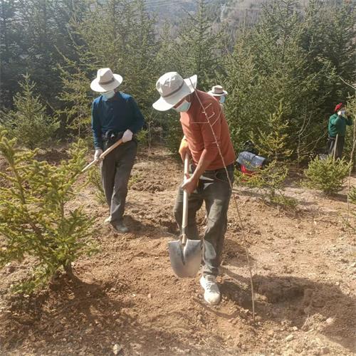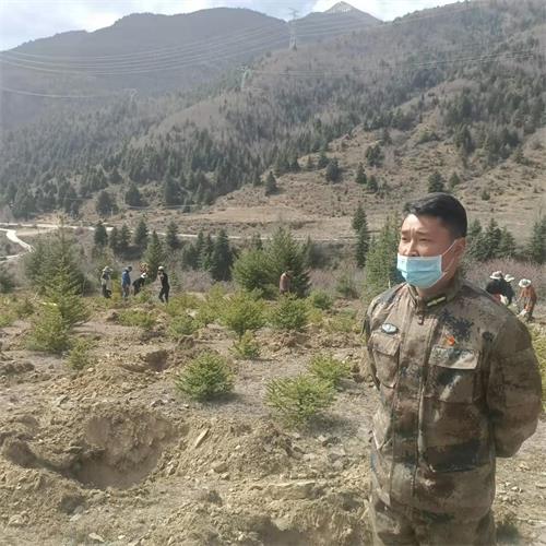 栽植现场,只见一台挖掘机不停地从这边转到那边,一小会儿的功夫,山坡野地里便布满一个个挖好的树坑,多吉大叔抱着一捆准备栽植的树苗,一棵接着一棵地放进挖好的树坑里。