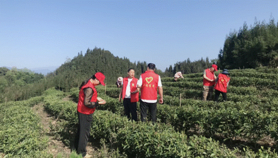 建设镇党员志愿服务者在光辉村帮助茶农采摘春茶