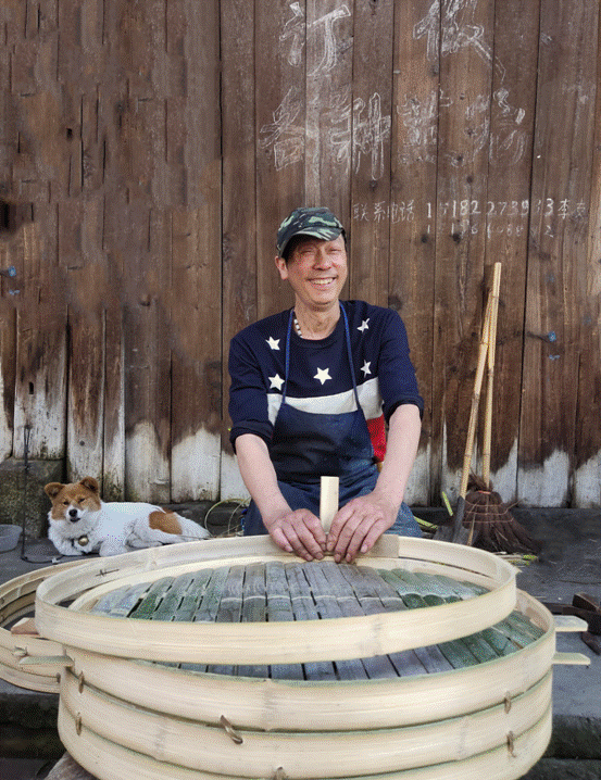 片刀上下翻飞,竹被劈成粗细匀净的韧片,经过一遍遍打磨,再刮去竹子里黄底层,竹片的颜色变得纯净。木质圆规在他手中飞快旋转,黑色的墨粉连成一个标准圆,竹质底片切割后紧密的拼接在先前制作的外圈里,不一会儿功夫,竹蒸笼的一层已然成型。