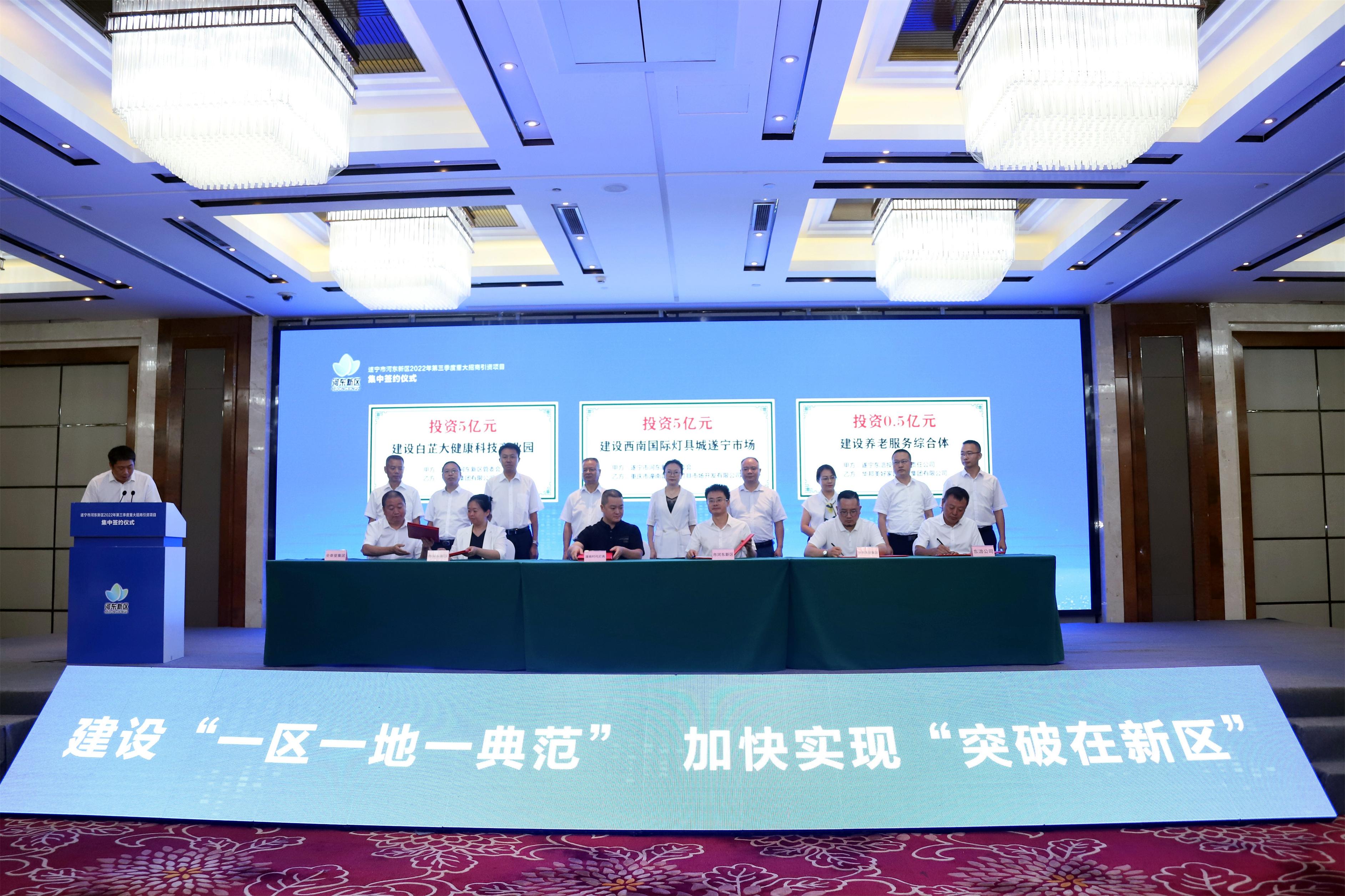 签约仪式现场,遂宁市河东新区与3家企业在建材家居、川白芷产业以及健康养老等领域签订合作协议。由潼南西南国际灯具城投资建设综合型灯具行业一级批发集散市场、全泰堂集团有限公司投资建设白芷大健康科技产业园、华邦美好家园养老集团有限公司投资建设养老服务综合体,总投资约10.5亿元。
