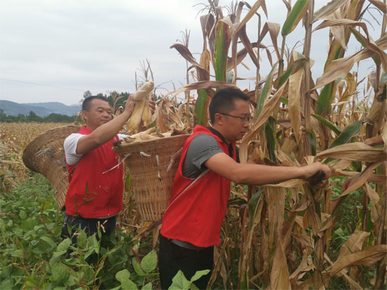 在石窝镇金山寺村大豆玉米套种地里,由驻村干部、村“两委”、志愿者组成党员志愿服务队身穿红马甲,头戴红帽子,在一垄垄的田地里掰玉米、装车、转运……,忙碌的身影绘就了一幅热火朝天的劳动画卷。