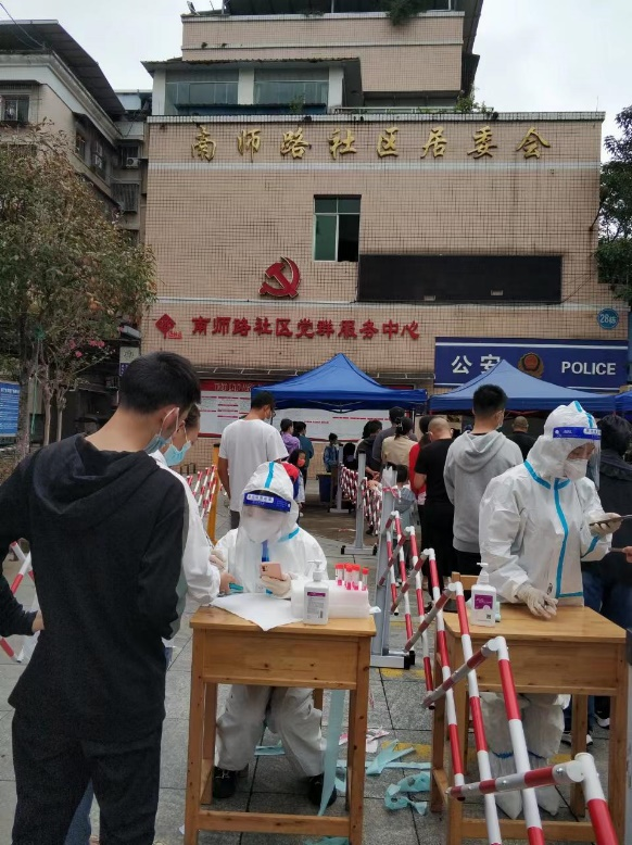 9月20日—21日,在主城区开展的两次全员核酸检测中,市文化馆、市博物馆、市文物保护所、市图书馆和市川剧团志愿服务队全体出动,共派出50余人次分别增援经开区富源路街道、南强街道所辖的共8个社区核酸检测点,主要负责现场秩序维护、引导居民扫描健康码和核酸信息数据采集。