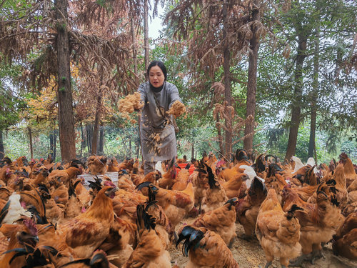 家庭农场主、“鸡司令”童琼挑着玉米、麦子、豆子拌的午餐,随着“喔-喔-”的呼唤声,松树林山上散养的生态鸡闻声赶来,围绕在童琼身边,抢食起来。
