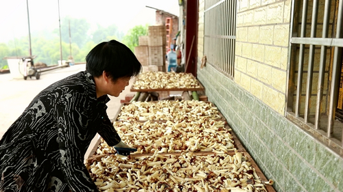 2019年,刘宣华、陈长聪夫妇返乡创业种植蘑菇,经过3年发展,创办竹荪种植基地,种植长裙竹荪、棘托竹荪、球盖菇共80余亩。现在正是球盖菇采摘季,丈夫刘宣华每天一大早就到周边跑销售,妻子陈长聪则留守在家,带领着十多名村民忙着采收新鲜的球盖菇,将它们处理烘干后及时供应到市场。
