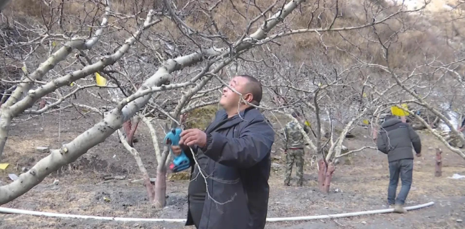 松潘县满山红花椒合作社成员卢洪友介绍,“今年开春开得早,我们满山红合作社组织村民社员趁早把花椒树的枝修了, 花椒枝修了马上就要上农家肥了,农家肥了上了我们马上就要打石硫合剂,今年天气非常好,我们希望我们花椒有一个好的收成。”满山红花椒合作社成员结合实际情况,向种植户讲解了冬春季对果树进行科学田间管理,如何施好农家肥,让果树发挥更大效益,给种植户传授先进的种植技术经验,解决疑难问题。