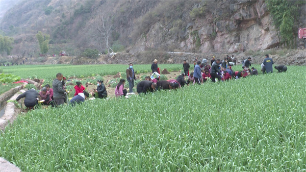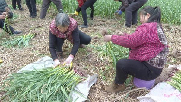 张正才家种植了2亩多的蒜苗,其中有1亩蒜田特意种植的迟蒜种,为的就是隔开集中上市的时间,家里人能有充足的时间进行采收。没想到的是,因这块蒜田紧挨着国道108线,蒜苗长势喜人,被一名成都的过路客商看上了。为了以最快最高效的速度完成收购商的订购数量,张正才特地邀请家里的亲戚朋友前来帮忙采收。