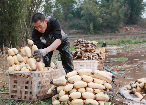 四川新闻网消息 近日,在龙马潭区金龙镇西坛村的河藕基地里,趁着晴好天气,挖藕工人们正穿着连体下水裤,弯着腰采挖莲藕,现场一派忙碌。