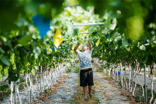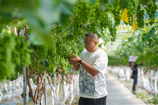 “目前,主要进行葡萄疏果以及枝条管理,目的是让葡萄成熟后颗粒更均匀,糖分更高,口感更好。”廖磊在他的联栋大棚内说道。