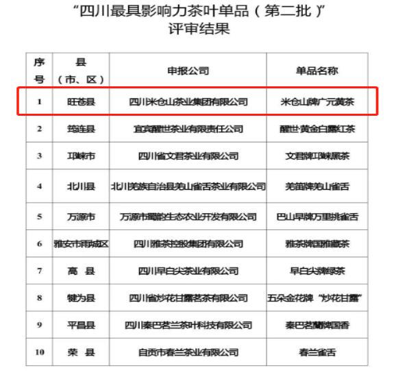 目前公示期已过,旺苍县特色黄茶茶乡荣获“四川十大最美茶乡”,四川米仓山茶业集团有限公司所属茶品米仓山牌广元黄茶荣获“四川最具影响力茶叶单品(第二批)”。