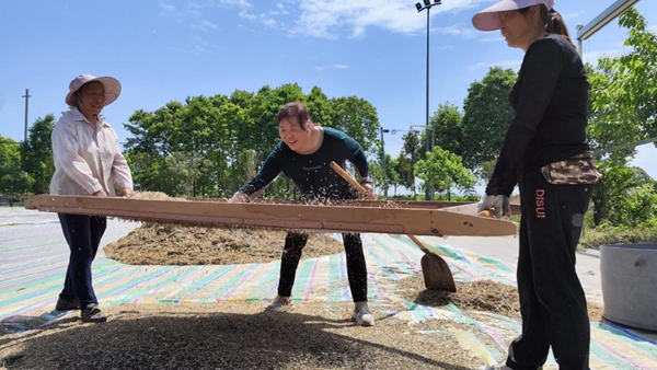 来到金山镇富荣村田间地头,伴着机器的轰鸣声,7台收割机在田间来回穿梭,将油菜不断“吞入”腹中,油菜收割、角果脱壳等程序一气呵成。在收割机的后端,油菜籽从卸粮口源源不断地流入车厢,村民们一车接一车把油菜籽运到村里的晒粮场进行晾晒、籽皮分离等操作。同时,收割机的尾部吐出粉碎后的油菜秸秆,沿着收割机的路线整齐地喷洒在田间,立即成为田间的肥料,不仅能提高田间肥力效果,还能减轻秸秆禁烧工作的压力。