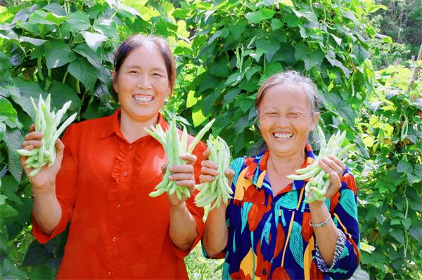 郁郁葱葱的地里,前来务工的村民三三两两分散在各处忙碌采摘着,随着一声脆响,新鲜的四季豆应声摘下,随手放入身旁的筐里,动作娴熟利索,忙而有序,一会儿的功夫整个筐就装满了。