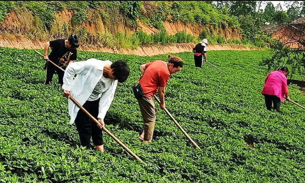近日,王家村村民正在花生地里忙着除草、培土。镇上农业服务中心经常到现场指导,目前遇到的卷叶虫病经过科学防治,长势良好。
