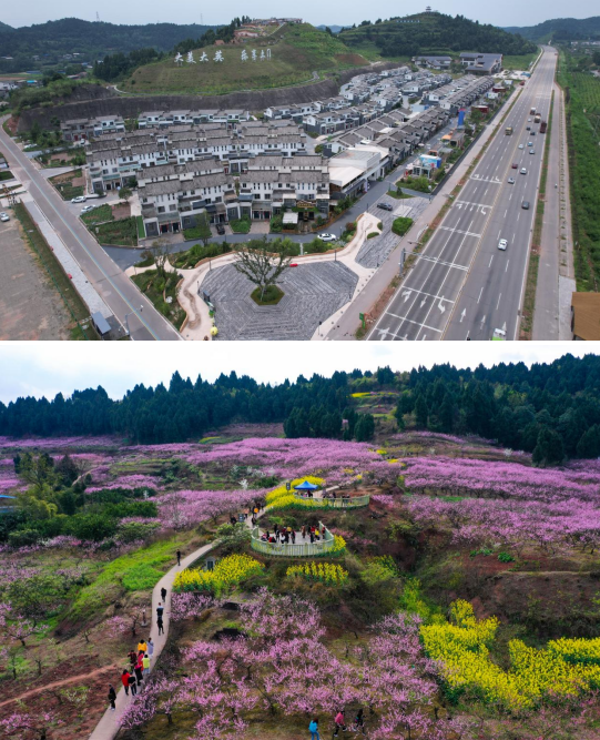实现城乡融合发展,需要夯实城乡融合发展的“乡村基点”。在卓筒井镇干屏村,从观景平台远眺,满山的桃树尽收眼底,呈阶梯状向四周扩散。这些桃树最早栽种于17年前,甜桃产业已成为为干屏村乃至大英重要的农业产业。