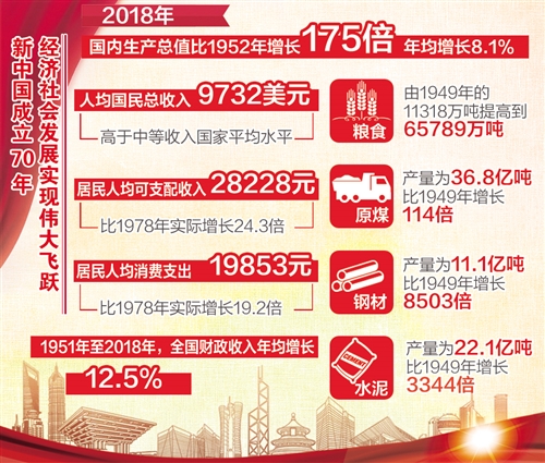 新中国诞生时,我国经济基础极为薄弱。1952年我国国内生产总值仅为679亿元,人均国内生产总值为119元。经过长期努力,1978年我国国内生产总值增加到3679亿元,占世界经济的比重为1.8%,居全球第11位。 改革开放以来,我国经济快速发展,1986年经济总量突破1万亿元,2000年突破10万亿元大关,超过意大利成为世界第六大经济体,2010年达到412119亿元,超过日本并连年稳居世界第二。 党的十八大以来,我国综合国力持续提升。近3年,我国经济总量连续跨越70万亿元、80万亿元和90万亿元大关,2018年达到900309亿元,占世界经济的比重接近16%。按不变价计算,2018年国内生产总值比1952年增长175倍,年均增长8.1%;其中,1979年至2018年年均增长9.4%,远高于同期世界经济2.9%左右的年均增速,对世界经济增长的年均贡献率为18%左右,仅次于美国居世界第二。2018年我国人均国民总收入达到9732美元,高于中等收入国家平均水平。 随着经济总量的扩大,财政实力由弱变强。1951年至2018年全国财政收入年均增长12.5%,其中1979年至2018年年均增长13.6%,为促进经济发展、改善人民生活提供了有力的资金保障。 此外,我国国际地位显著提升,影响力日益彰显。党的十八大以来,我国积极推动共建“一带一路”,得到160多个国家(地区)和国际组织的积极响应;倡议构建人类命运共同体,积极参与以WTO改革为代表的国际经贸规则制定,在全球治理体系变革中贡献了中国智慧,展现了大国担当。 原标题:2018年我国人均国民总收入达9732美元 |