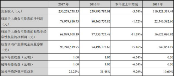 上市当年,宇环数控业绩下滑。2017年,宇环数控的营业收入为2.50亿元,同比减少3.74%;归属于上市公司股东的净利润7897.98万元,同比减少1.72%;归属于上市公司股东的扣除非经常性损益的净利润6889.91万元,同比减少11.39%;消费电子制造业毛利率43.72%,比上年减少7.78个百分点。