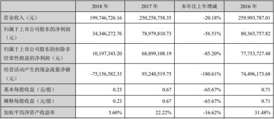 上市第二年,宇环数控业绩明显下滑。2018年,宇环数控的营业收入为2.00亿元,同比减少20.18%;归属于上市公司股东的净利润为3434.63万元;同比减少56.51%;归属于上市公司股东的扣除非经常性损益的净利润为1019.43万元,同比减少85.20%;消费电子制造业毛利率34.56%,比上年减少9.16个百分点。