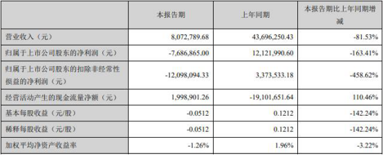 今年一季度,宇环数控业绩继续大幅下滑。2019年第一季度,宇环数控的营业收入为8072.79万元,同比减少81.53%;归属于上市公司股东的净利润为-768.69万元,同比减少163.41%;归属于上市公司股东的扣除非经常性损益的净利润为-1209.81万元,同比减少458.62%。