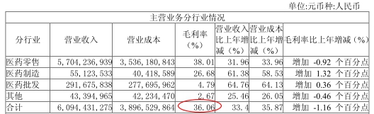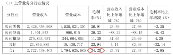 上图来源老百姓2018年年报 2019年一季报显示,老百姓实现营业收入27.27亿元,同比增长23.37%,实现归属于上市公司股东净利润1.59亿元,同比增长22.13%。 毛利率方面,今年一季度末,老百姓毛利率下滑至34.20%,较2018年同期下降2.05个百分点。
