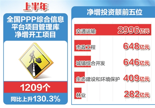本报北京8月1日讯 记者曾金华报道:财政部政府和社会资本合作(PPP)中心1日发布统计数据显示,上半年,全国PPP综合信息平台项目管理库净增开工项目1209个,同比上升130.3%,净增开工项目投资额2万亿元,同比上升130%。