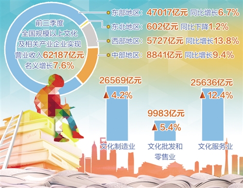 本报北京10月31日讯 记者林火灿报道:国家统计局发布的数据显示,根据对全国5.6万家规模以上文化及相关产业企业调查,今年前三季度,上述企业实现营业收入62187亿元,按可比口径计算同比名义增长7.6%,总体继续保持平稳较快增长。 分行业类别看,文化及相关产业9个行业中,有8个行业的营业收入实现增长。其中,增速超过10%的行业有3个,分别是:新闻信息服务营业收入4656亿元,比上年同期增长22.4%;创意设计服务8256亿元,增长12.2%;文化投资运营308亿元,增长12.3%。 分产业类型看,文化制造业营业收入26569亿元,比上年同期增长4.2%;文化批发和零售业9983亿元,增长5.4%;文化服务业25636亿元,增长12.4%。 分领域看,文化核心领域营业收入37065亿元,比上年同期增长10.8%;文化相关领域25122亿元,增长3.3%。 分区域看,东部地区规模以上文化及相关产业企业实现营业收入47017亿元,比上年同期增长6.7%,占全国比重为75.6%;中部、西部和东北地区分别为8841亿元、5727亿元和602亿元,分别增长9.4%、13.8%和下降1.2%,占全国比重分别为14.2%、9.2%和1.0%。 原标题:前三季度规模以上文化及相关产业企业营业收入增长7.6% |
