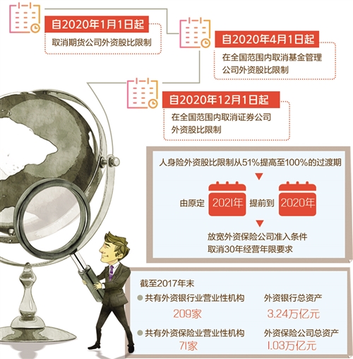 明确对一些金融公司取消外资持股比例限制,并且比原计划时间提前,主要原因是目前我国一些金融机构的发展已经比较成熟,具备较强的抗风险能力。同时,引进国外金融机构也有助于产生“鲇鱼效应”,外资股比限制取消后,国内金融机构更加丰富,有助于形成良性竞争的局面,加大对实体经济的支持—— 我国金融业开放再“加码”。继7月份国务院金融委推出11项金融业进一步对外开放政策举措后,近期,金融业进一步开放举措又密集推出。10月11日,中国证监会推出细化措施,明确了取消证券公司、基金管理公司、期货公司外资股比限制时点。10月15日举行的国新办新闻发布会上正式发布了《国务院关于修改〈中华人民共和国外资保险公司管理条例〉和〈中华人民共和国外资银行管理条例〉的决定》。中国银保监会负责人在发布会上表示,正在制定《外资保险公司管理条例》和《外资银行管理条例》实施细则,并将很快推出。 武汉大学国际金融法教授、博士生导师李仁真认为,上述两个条例的修改,以行政法规形式将扩大金融业开放的政策措施固定下来,标志着我国金融业对外开放迈向新征程。 在业内看来,此轮金融业进一步开放“多管齐下”,正是对国务院金融委11项金融业进一步对外开放的政策措施的细化。在这11项举措中,开放领域涉及银行、保险、券商、债市等多个领域,开放时点前移、准入限制相较此前再度放宽。此次金融业进一步开放,也向全世界展示我国对外开放的坚定决心,彰显“稳金融”信心。 开放时点前移 10月11日,证监会表示,自2020年4月1日起,在全国范围内取消基金管理公司外资股比限制;自2020年12月1日起,在全国范围内取消证券公司外资股比限制。证监会将继续坚定落实我国对外开放的总体部署,积极推进资本市场对外开放进程,扎扎实实做好每一项对外开放的具体工作,继续依法、合规、高效地做好合资证券公司、基金管理公司设立或变更实际控制人审核工作。 另外,自2020年1月1日起,取消期货公司外资股比限制,有关主体可根据《期货交易管理条例》《期货公司监督管理办法》《外商投资期货公司管理办法》等相关规定提交行政许可申请、符合条件的境外投资者持有期货公司股权比例可至100%。 前海开源基金首席经济学家杨德龙表示,国务院金融委11项举措是中国进一步对外开放的重要表现,也体现了推动金融领域开放的决心。证监会此次明确提前一年放开外资对一些金融公司的股权比例限制,势必吸引更多的外资流入,未来也会有更多的外资金融机构愿意进入中国市场。 除此之外,涉及金融开放时点变化的还包括“人身险外资股比限制从51%提高至100%的过渡期,由原定2021年提前到2020年”“放宽外资保险公司准入条件,取消30年经营年限要求”。据悉,目前外国保险公司来华设立外资保险公司需满足经营保险业务30年以上的要求。银保监会表示,近年来,随着对外开放的深化,大部分入榜《财富》世界500强的外国保险公司都已进入中国,在中国保险市场发挥了积极作用。取消30年经营年限要求,为具有经营特色和专长但经营年限不足的外国保险公司来华创造了条件。 有助优势互补 银保监会相关负责人对涉及银行保险等领域的开放举措做出详细解读,开放举措中“允许境外资产管理机构与中资银行或保险公司的子公司合资设立由外方控股的理财公司”一项,在该负责人看来,“我国资管市场规模和发展潜力巨大,现有资管机构难以完全满足快速增长的多元化市场需求。包括理财子公司在内的中资银行和保险公司资管机构,与国际先进资管机构相比,多数成立时间较短、经验较少”。 上述负责人表示,“目前,中资银行、保险公司与外资先进资管机构以业务合作为主,允许合资成立外资控股理财公司,有利于引进国际先进的资管实践和专业经验,促进资管业及资本市场稳健发展,有利于发挥中外资资产管理机构各自优势,进一步丰富市场主体和业务产品,满足投资者多元化服务需求。同时,现有中资银行和保险公司资管子公司可以与其参股的外方理财公司形成互补,适度错位发展”。 据介绍,允许境外资产管理机构与中资银行或保险公司的子公司合资设立由外方控股的理财公司,前期可采取试点方式,优先支持国外市场公认的成熟稳健财富管理机构进入,既可全部募集人民币资金,也可募集部分外币长期资金。 银保监会表示,在试点过程中,将更加注重监管的专业性、审慎性、稳定性,更加注重事中事后监管,通过现场检查和非现场监管等方式引导机构合规稳健发展,并及时总结试点经验,适时研究扩大试点范围。 业内认为,明确对一些金融公司取消外资持股比例限制,并且比原计划时间提前,主要的原因是目前我国一些金融机构的发展已经比较成熟,具备较强的抗风险能力,同时,引进国外金融机构也有助于产生“鲇鱼效应”,外资股比限制取消后,国内金融机构更加丰富,有助于形成良性竞争的局面,加大对实体经济的支持,也将推动我国金融市场更加规范和成熟。 机遇大于挑战 国务院金融委在发布金融业进一步对外开放的11项政策举措时表示要按照“宜快不宜慢,宜早不宜迟”的原则,传递出加快金融业开放步伐的信号。 信心来自实力。经过多年的发展,我国已成为一个名副其实的金融大国。中资银行海外业务占比不断提升,对实体经济