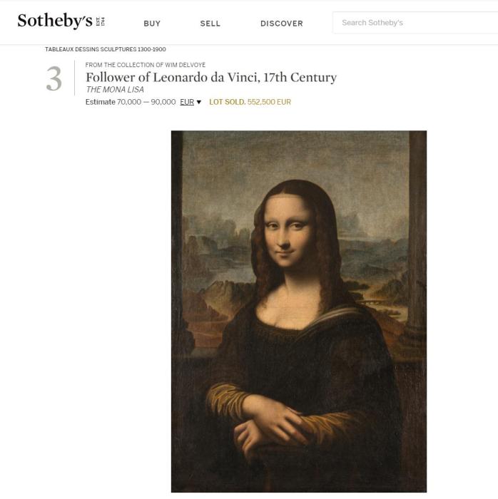 中新网11月21日电 综合报道,日前,一幅达·芬奇名作《蒙娜丽莎》的复制品在苏富比拍卖行售出,成交价格55.25万欧元(约合人民币430万元)。 苏富比拍卖行关于这幅画作的说明。(图片来源:苏富比网页截图) 据称,这幅复制品创作于17世纪,最初估价为7万到9万欧元。最终的成交价远远高于估计。专家称,这是一幅质量上乘之作。有意思的是,复制品比达芬奇的原画还略大。 苏富比拍卖行董事鲍克·科能(Baukje Coenen)在一份声明中表示,这一结果证明了“这幅标志性画作的持久魅力”。 《蒙娜丽莎》真迹藏于巴黎卢浮宫。 原标题:“假画”也值钱?《蒙娜丽莎》复制品拍出430万元 |