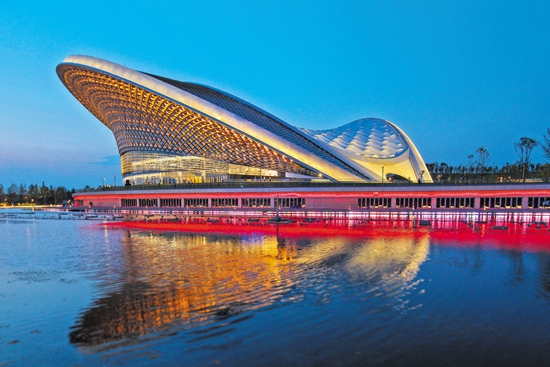 金钟广场位于成都露天音乐公园北部。傍晚时分,绚丽的灯光让成都露天音乐公园穹顶天幕格外引人注目。本报记者 胡大田 摄