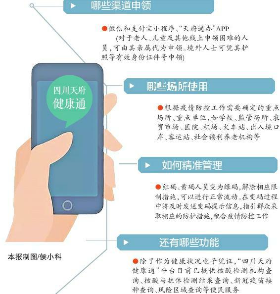 四川日报全媒体记者 付真卿 1月11日,四川全省统一的健康码——“四川天府健康通”正式上线。即日起,所有在川人员及来(返)川人员都可以申领一人一码、实名认证的“四川天府健康通”健康码,持绿码的人员可以在全省范围内一码通行。 为何要在此时推出全省统一的健康码?新健康码如何申领使用?其在疫情常态化精准防控中又能发挥哪些作用?11日,四川省应对新型冠状病毒肺炎疫情应急指挥部(以下简称“省应急指挥部”)和省大数据中心相关负责人接受了记者采访,权威解读关于“四川天府健康通”的各类问题。 实行一人一码、一码通行、实名认证 问:推出全省统一健康码有何背景? 答:根据国务院联防联控机制明确要求,原则上各省(区、市)只保留一个统筹建设的健康码。同时,考虑到目前国内外复杂严峻的疫情防控形势和四川近期的情况,加之春节将至,四川作为人口流动大省面临的防控难题等多方面因素,省应急指挥部决定建设全省统一的健康码和疫情防控大数据平台,以适应常态化精准防控和局部应急处置需要,服务群众有序流动,健全大数据防控机制,保障数据安全。 省大数据中心具体负责“四川天府健康通”的研发,在总结吸收成都市已有数据和经验做法,并学习借鉴北京、上海、广东的健康码服务功能的基础上,省大数据中心研发团队通过24小时不间断轮班攻坚,在14天之内就实现了平台运行测试和上线。 问:新的健康码如何申领? 答:“四川天府健康通”实行一人一码、一码通行、实名认证,目前主要通过3个渠道申报:微信和支付宝小程序、“天府通办”APP。 对于老人、儿童及其他线上申领困难的人员,可由其亲属代为申领。境外人士可凭其护照等有效身份证件号申领。 问:成都“天府健康通”还可以使用吗? 答:此前在成都地区使用的“天府健康通”健康码整合到省平台,成都的“天府健康通”可与全省统一的“四川天府健康通”实现无感切换。省内各地各部门不得再自行设置运营其他疫情防控码,确保持“四川天府健康通”绿码人员在全省范围内一码通行。 同时,国家防疫健康信息码和其他省(区、市)依托全国一体化政务服务平台落实了信息互认的健康码,在四川境内也可以作为通行凭证。“四川天府健康通”也将逐步推动在其他部分省(区、市)的跨省互认。 按红色禁止、黄色限制的方式管控人员流动 问:哪些场所需要使用健康码? 答:根据疫情防控工作需要确定的重点场所、重点单位,如学校、监管场所、农贸市场、医院、机场、火车站、出入境口岸、客运站、社会福利养老机构等,要严格对出入人员落实健康码扫码查验等疫情防控要求。 一些重点行业或场所可及时申领专有二维码(场所码),供出入人员扫码核验。同时,各重点场所要注重做好老年人、儿童等人群服务工作,优化亲友代办、工作人员代查等服务,具备条件的重点场所可设立“无码通道”,做好健康监测和信息登记。 问:新的健康码如何实现分类精准管理? 答:“四川天府健康通”通过对个人数据进行计算分析,根据赋码规则,将人员状态分为红码、黄码和绿码,并按照红色禁止、黄色限制的方式管控人员流动。随着时间推移或者核酸检测阴性等条件变化,红码、黄码人员变为绿码,解除相应限制措施,可以进行正常流动。在变码过程中将及时发送变码提示信息,指引群众采取相应的防护措施,配合疫情防控工作。 问:“四川天府健康通”还有哪些功能?遇到疑难问题怎么办? 答:除了作为健康状况电子凭证,“四川天府健康通”平台目前已提供核酸检测机构查询、核酸与抗体检测结果查询、新冠疫苗接种查询、风险区域查询等便民服务,今后还将持续推出更多更便捷的服务。在使用中如有疑问,可以通过“四川天府健康通”在线咨询,也可拨打12345政务服务热线咨询。 原标题:三个渠道申领 一码通行全川——揭秘全省统一健康码“四川天府健康通”