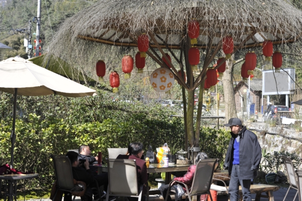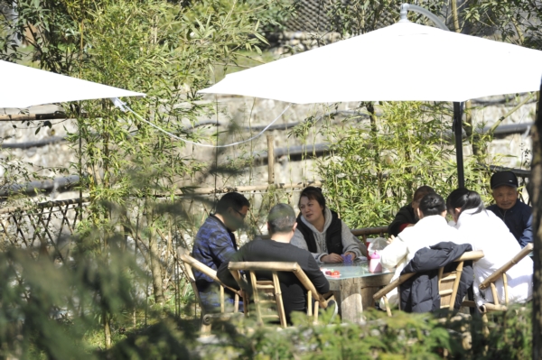 或三人围坐在遮阳伞下喝茶聊天,或一家五口轮流翻炒土灶里的鸡肉,又或者夫妻俩在民宿前来张自拍。景区里虽然一幅热闹的画面,但也保持着彼此默认的距离。