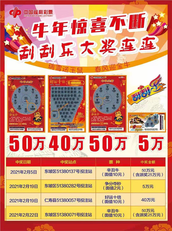 四川新闻网消息(孙学成 卞美旋 文/图)2月22日,三名“牌友”在眉山市东坡区景苏东街一茶楼等人打麻将,最后一名“牌搭子”却迟迟未到。“三缺一”之际,其中一人提议到对面的51380071号福彩投注站购买“中25万送25万 中100万送100万”的“辛丑牛”即开型彩票。