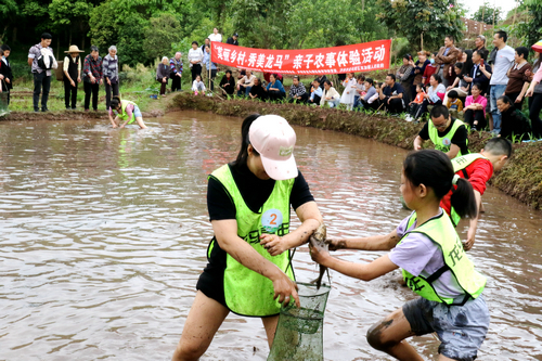 亲子捉鱼现场,随着比赛号令的发出,早已摩拳擦掌、跃跃欲试的家长和孩子们纷纷跃进稻田里。爸爸们拿出平时矫健的身姿俯身捉鱼,妈妈们则一改往日淑女形象,张开双手就在水里摸起来,孩子们则在爸妈的帮助下各显神通,拿出自己捕鱼的独门绝活,开心地在稻田里捞着,搅得稻田一片沸腾。围观的游客和当地群众或加油助威,或支招捉鱼技巧,或探讨着鱼的各种吃法,交谈声、叹气声、欢呼声此起彼伏,久久回荡在双加镇十里渔湾生态园内。