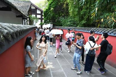 5月3日,成都杜甫草堂博物馆内的影壁、红墙成了全国各地游客的打卡地。