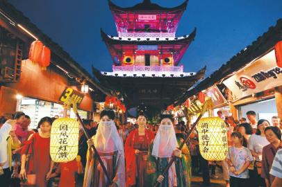 5月2日,阆中古城上演汉服提灯夜游,游人和汉服爱好者一起穿越街巷,穿越古今,感受古城夜之美。