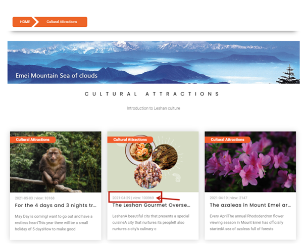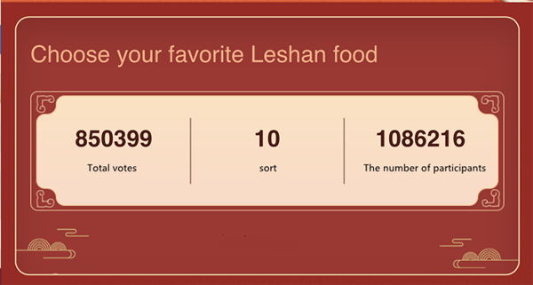 活动推出10款乐山特色美食进行在线投票,在Hi—Leshan国际网站、YouTube、Twitter,官方平台上同时推送。活动开始后,众多网友在线投票,选取出了自己心中的“乐山美食”,最终票数最多的前6种美食分别是:油炸串串、麻辣烫、烧烤、翘脚牛肉、甜皮鸭、钵钵鸡,入选2021年度外国友人最喜爱的乐山美食。