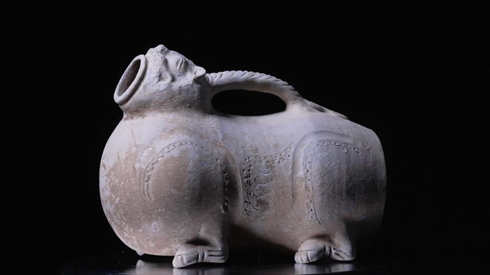 一到现场,记者就被西晋至南朝时期的一件青瓷虎子吸引了,这件成都地区出土的文物分外可爱,就像一只趴着的小老虎,昂着脑袋,张嘴大吼,背上还有一个提梁。据了解,这件虎子出土于汉晋南北朝时期墓葬中,这类瓷器产品在长江中下游较为常见,在成都平原出土则较为少见,是一件结合了实用性与艺术性的早期青瓷佳品。