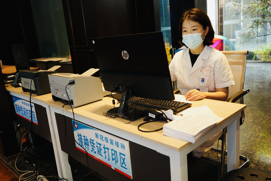 锦江区沙河街道新冠疫苗临时接种点,设有接种凭证打印台,是接种点专门为出国人员等需要凭证的重点人群设立的。魏冯摄。