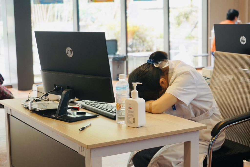 锦江区沙河街道新冠疫苗临时接种点,正值午休,不少工作人员趁着中午,伏桌休息。魏冯摄。