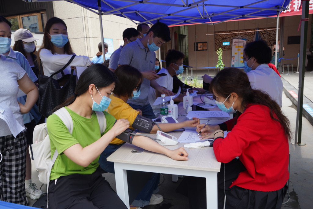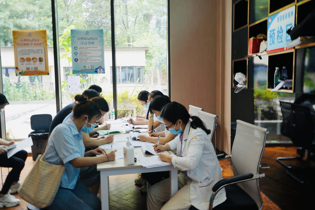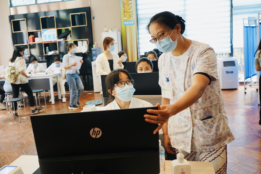 锦江区沙河街道新冠疫苗临时接种点,进入的居民要先测血压等。魏冯摄。 据杨春燕介绍,目前沙河街道新冠疫苗的接种点位从5月10日开始进行大规模接种,每天接种人次大约1300人,承接了沙河街道7个社区的接种服务,就目前接种情况来看,主动接种的群众与日俱增。“人员组织也有保障,像我们的工作人员在各个岗位上各司其职——主要分为行政负责岗、技术负责岗、预检岗、登记岗、打印凭证岗、医疗保障岗6类。” 杨春燕指着留观区附近的两台接种凭证打印台举例说,这是接种点专门为出国人员等需要凭证的重点人群设立的,按照居民需求专门为他们免费打印。